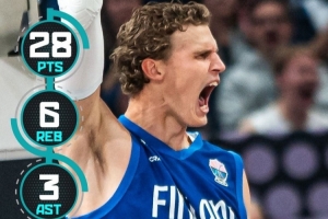 此役,芬兰球星马尔卡宁出战32分23秒,投篮15中7,三分4中2,罚球14中12,砍下28分6板3助2断,正负值为0。