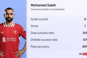 据天空体育统计,萨拉赫本场比赛传球成功率65%,所有非门将首发球员中最低,而且他在一周内第二次罚丢点球。