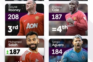 英超官方数据显示,萨拉赫现在已经打入187个英超进球,在英超历史射手榜上追平安迪-科尔,并列第四。